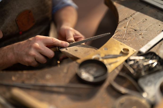 Finally, each piece returns to our workshop, where it is patiently refined: rough finishing, mirror polishing, and selective blackening, applied like a patina, to reveal its reliefs and give depth to the metal.