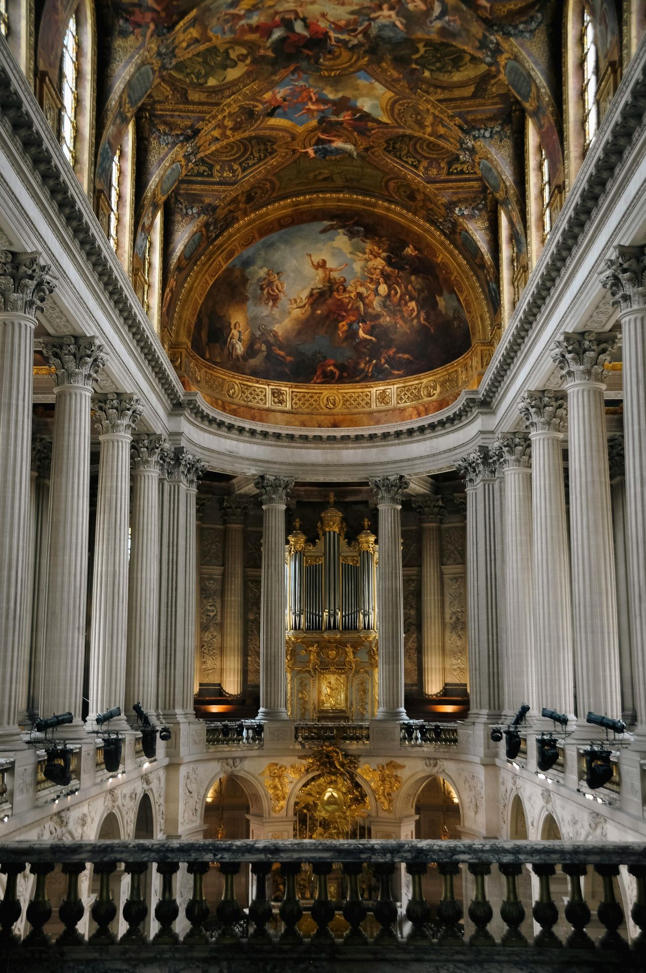 A masterpiece uniting royal magnificence and spiritual grandeur. Corinthian columns, painted vaults, monumental organ, and gleaming gold create a solemn, luminous atmosphere. The chapel embodies French Baroque: less undulating than Italian, but majestic and grand, serving both God and King.